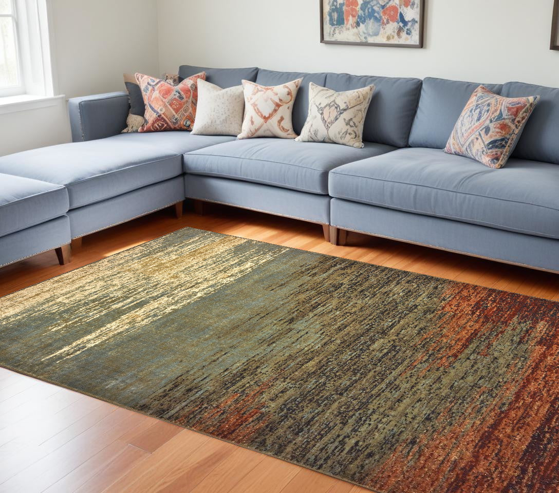 Accentuating a rich artistic appeal in its abstraction, this Blue and Brown Distressed Area Rug will add a dimension to your living space. The distressed patterns in the cosmic hues of cinnamon brown, spruce blue, sage, and beige set an alluring contrast and harmony at the same time, giving an illusion of breaking dawn. Made in the United States with enhanced durability in mind, this rug is machine-woven with inherently resistant polypropylene fibers to stand the test of fashion and function in high-traffic indoor areas. To add to its eminence, the low pile construction provides a soft and sumptuous surface texture that lends a cozy and inviting feel to any space. The abstract strokes in compelling colors make this area rug an ideal piece to fit in any casual setting without overwhelming its surrounding. 0.32” x 39.37” x 59.84”
