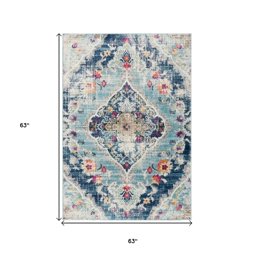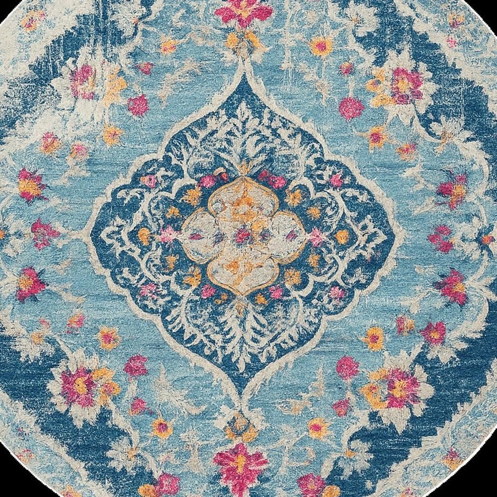 Set an inviting tone in your space with this 5-foot blue and gray oriental distressed round rug. This geometric round shaped rug features a oriental pattern in blue and gray that combines a good looking print with a unique and updated shape. The mix of shape, color, and design gives this rug refreshing visual interest. Ideal for spaces with kids and pets, this rug is stain resistant to help repel stains and spilled liquids. 63-inch H x 63-inch W x 0.4-inch D