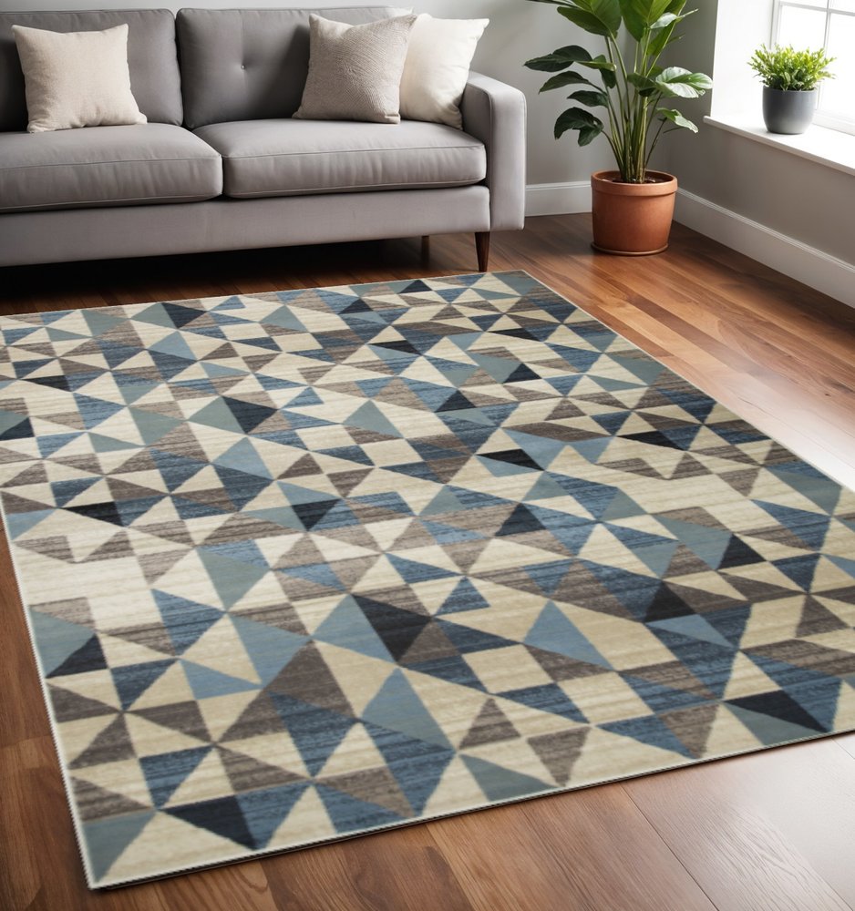 5' X 8' Beige Blue And Gray Geometric Area Rug