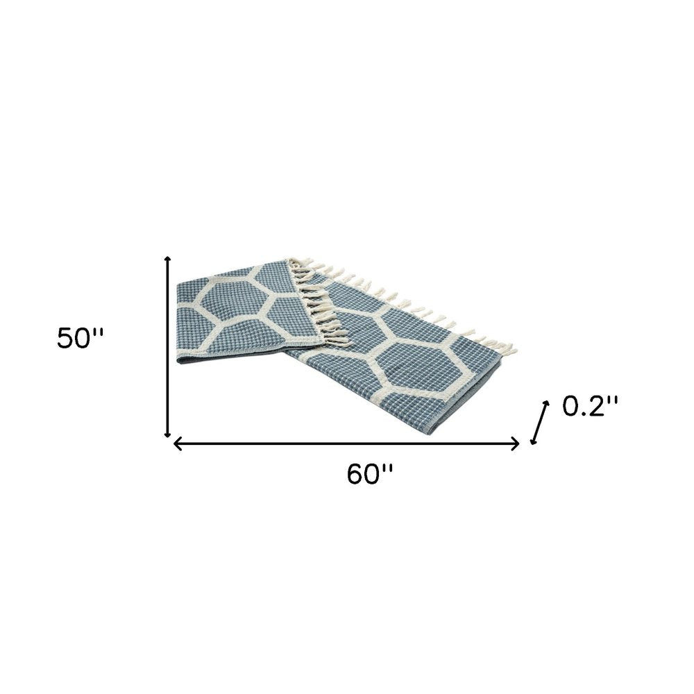 60" X 50" Blue and Off White Woven Cotton Geometric Throw Blanket with Fringe