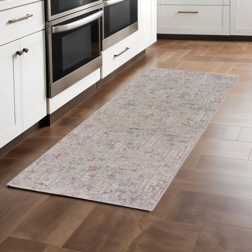 8' Gray Ivory Slate Blue And Wine Red Geometric Distressed Runner Rug