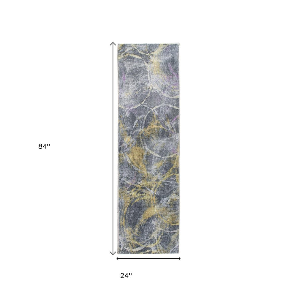 This 8-foot gray yellow and purple abstract runner rug, is a great way to add warmth to a room. Built to last, this rug crafted from polyester fibers is known for its durability and long lasting appeal. Rugs are a great way to showcase your style, hide imperfections, warm your home and reduce noise. This contemporary style runner makes a great accent for the hallway, in front of cabinets, in the laundry room, or any other space you need a narrow and long rug. 24.00-inch h x 84.00-inch w x 0.25-inch d.