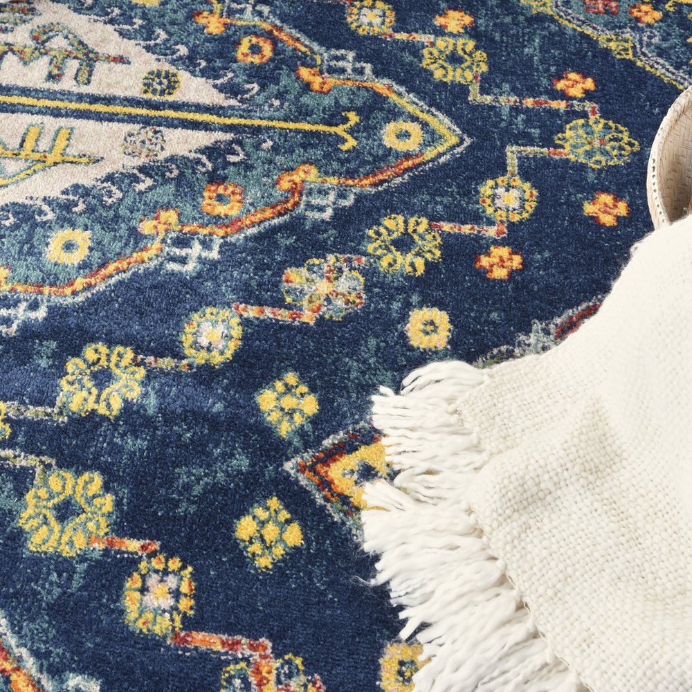Add some artistry to your room with this 8-foot x 10-foot blue and yellow oriental power loom area rug. This rectangle shaped rug features a oriental design in blue and yellow to give it visual interest. A classic shape marries with good looking design for your space place this area rug against a hardwood or tile floor and it will enliven your living space with style and sophistication. 94-inch H x 118-inch W x 0.25-inch D