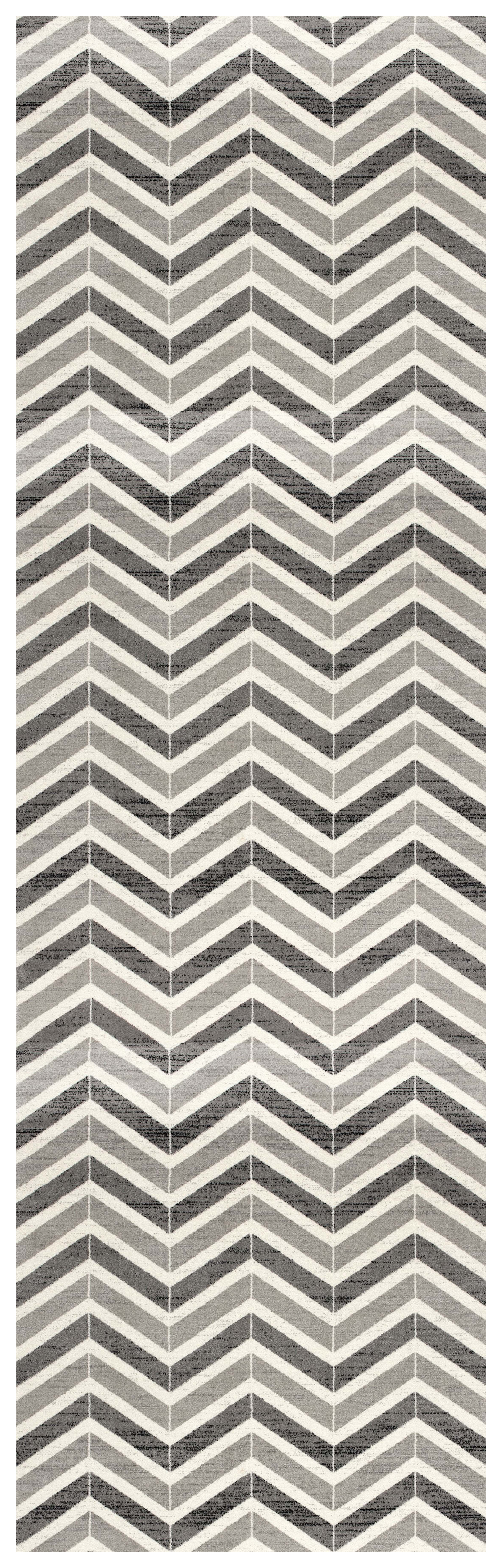 Set an inviting tone in your space with this 2-foot x 4-foot gray and ivory chevron distressed area rug. Ideal for spaces with kids and pets, this rug is stain resistant to help repel dirt and spilled liquids. Built to last, this rug crafted from olefin fibers is known for its durability and long lasting appeal. Rugs are a great way to showcase your style, hide imperfections, warm your home and reduce noise. This smaller sized, modern styled rug is just what you need for your walkway, bedside, in front of door, cabinet, refrigerator, or chair. 27-inch h x 48-inch w x 0.8-inch d.