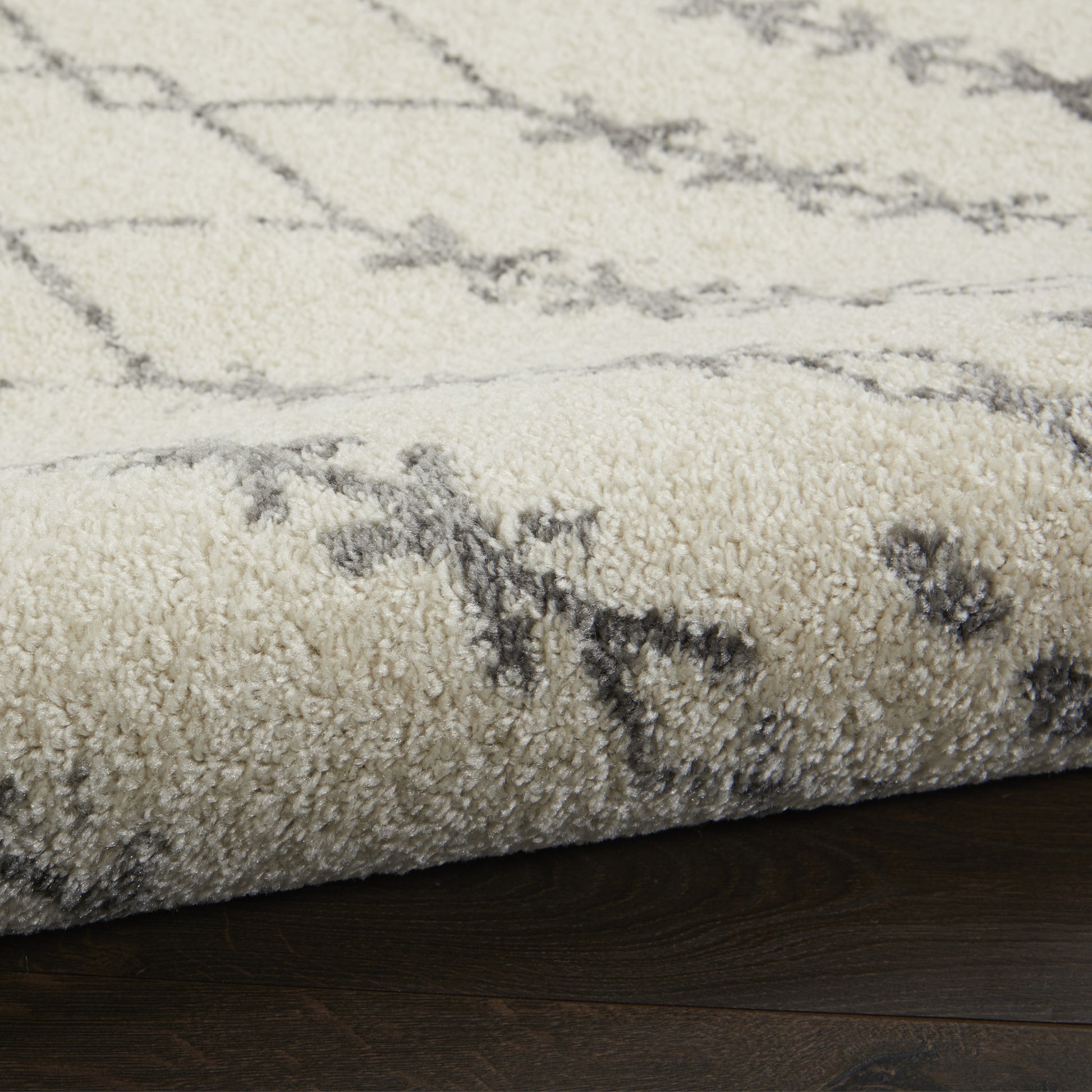 This 5-foot x 7-foot gray and ivory geometric distressed area rug, is a great way to add warmth to a room. Built to last, this rug crafted from polypropylene fibers is known for its durability and long lasting appeal. Rugs are a great way to showcase your style, hide imperfections, warm your home and reduce noise. This larger sized, transitional styled rug is ready to create a focal point or statement piece in your room. 63-inch h x 87-inch w x 0.5-inch d.