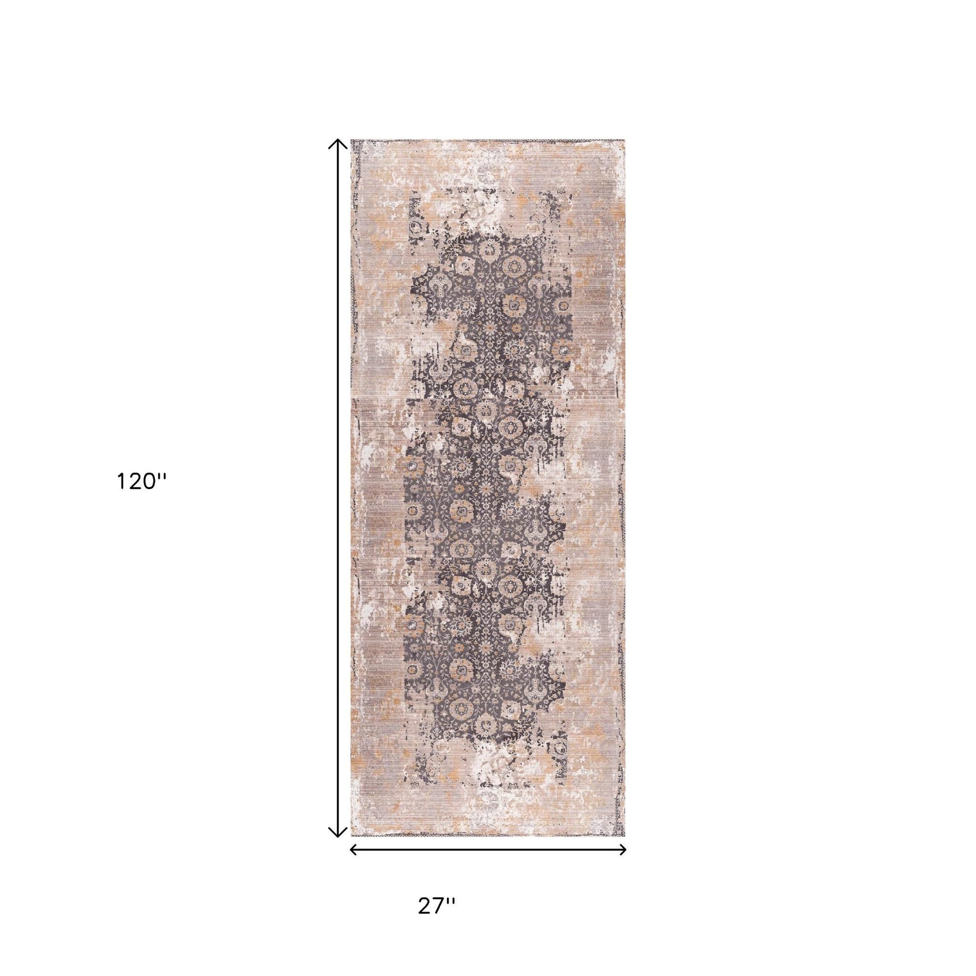 Add some artistry to your room with this 10-foot gray and ivory oriental runner rug. Built to last, this rug crafted from polyester fibers is known for its durability and long lasting appeal. Rugs are a great way to showcase your style, hide imperfections, warm your home and reduce noise. This rectangular shaped rug features a abstract design that will add a functional and decorative accent to your space. This modern style runner makes a great accent for the hallway, in front of cabinets, in the laundry room, or any other space you need a narrow and long rug. 27-inch h x 120-inch w x 0.6-inch d.