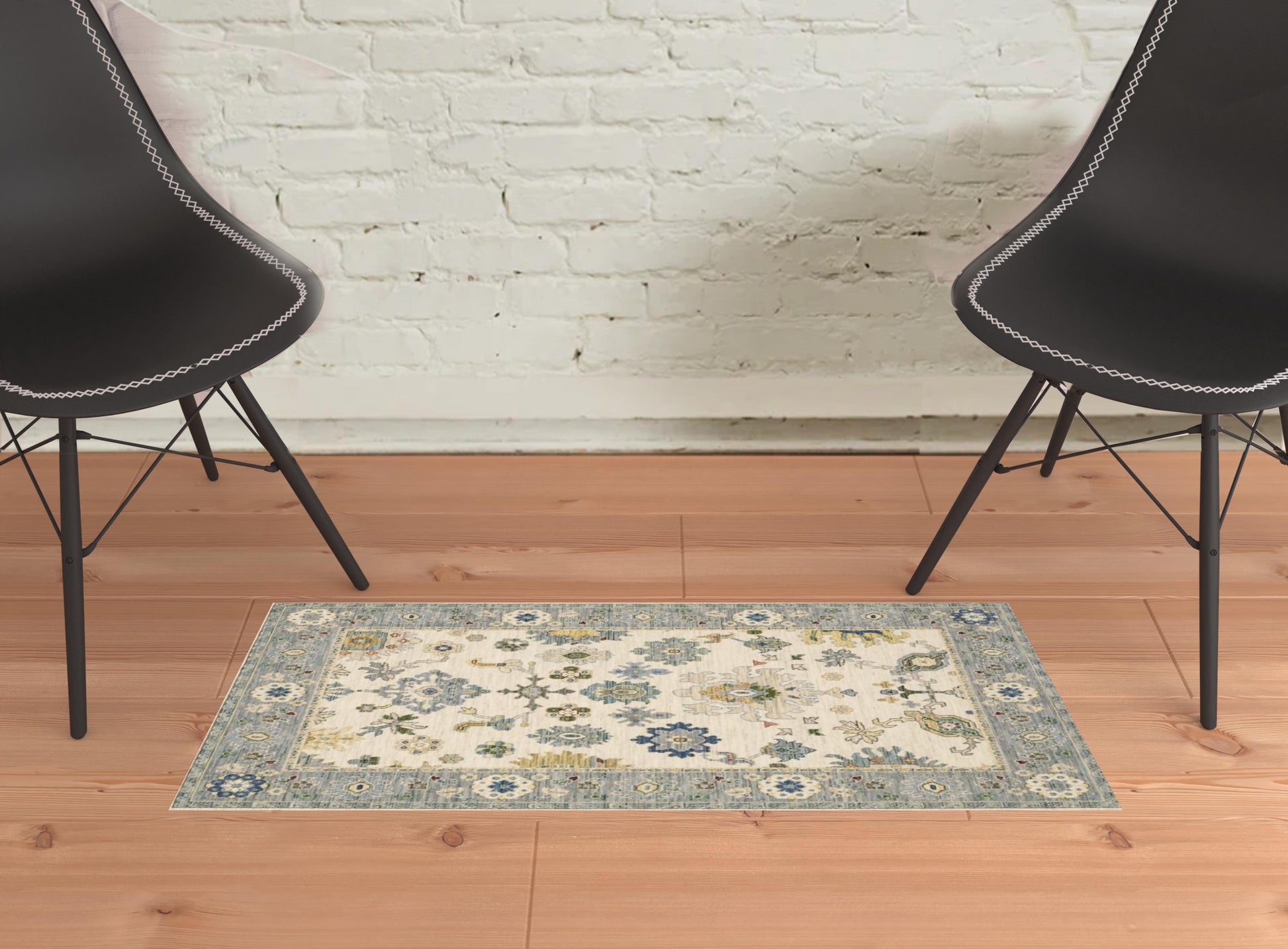 2' X 3' Blue Grey Gold Green Pink Orange Ivory And Red Oriental Power Loom Stain Resistant Area Rug With Fringe