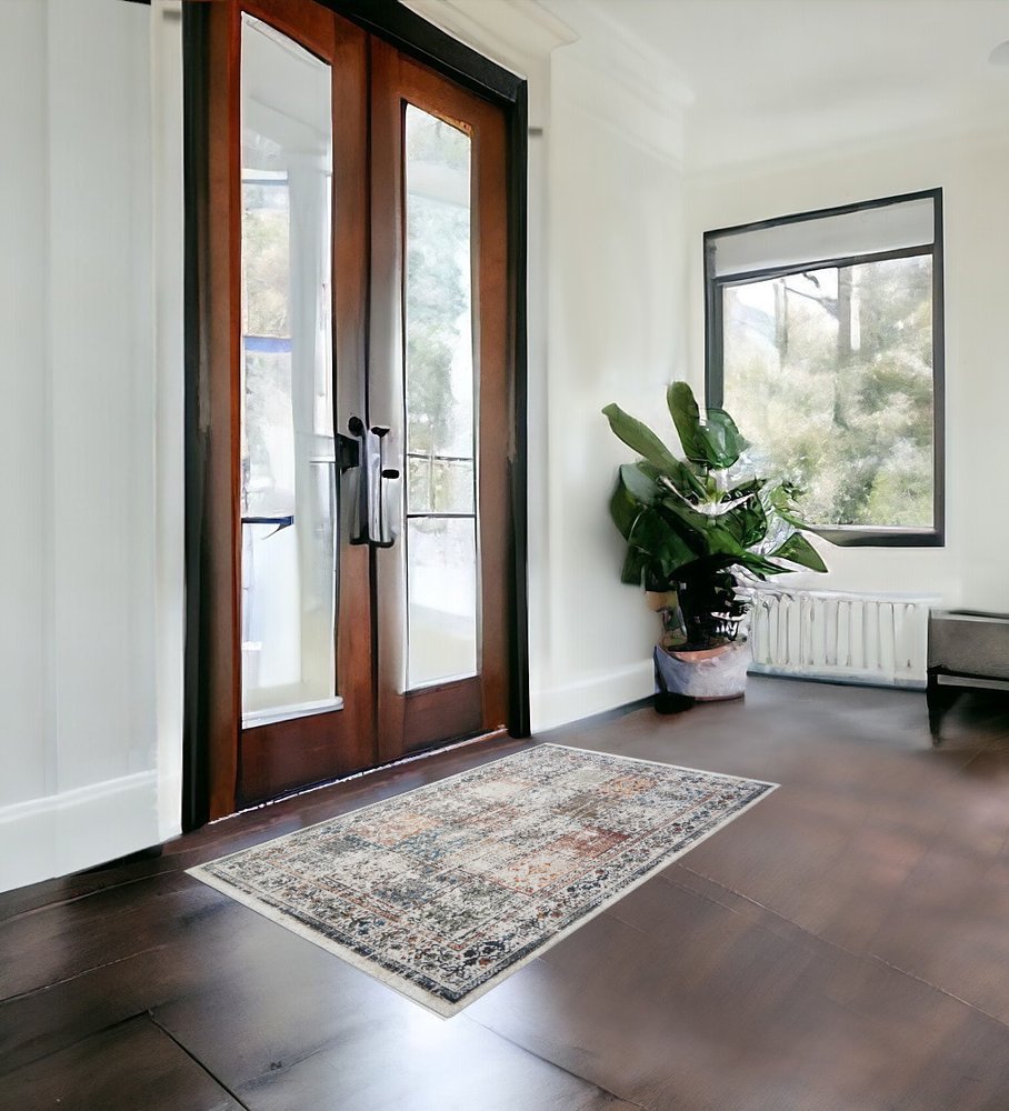 2' X 3' Ivory Blue and Gray Patchwork Distressed Area Rug With Fringe