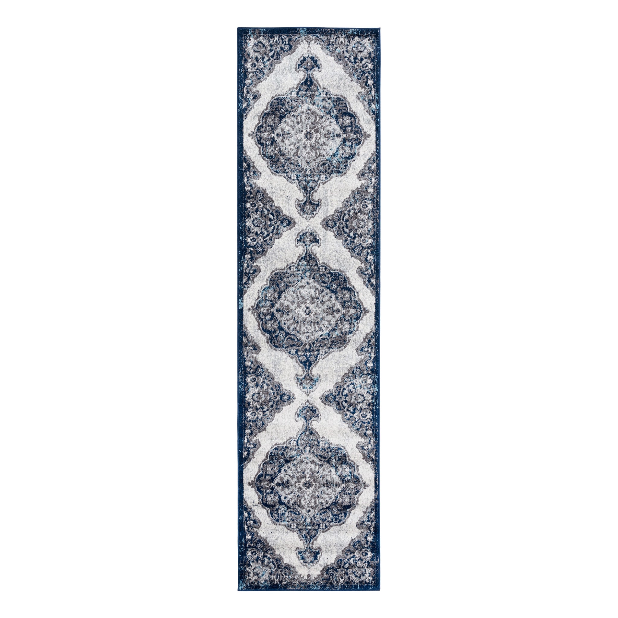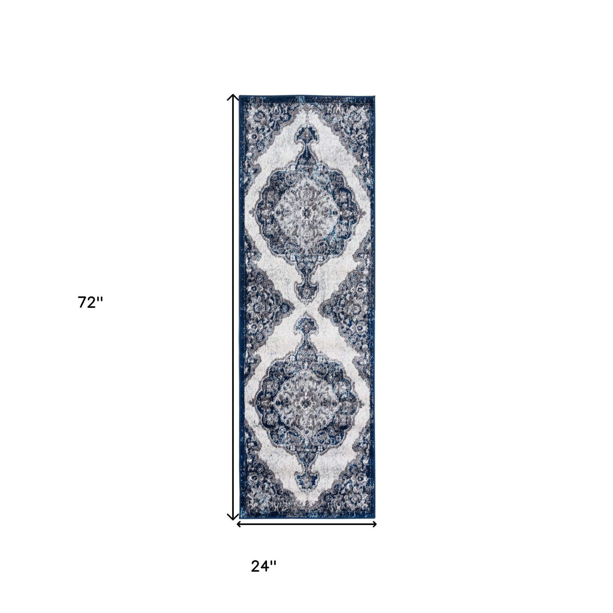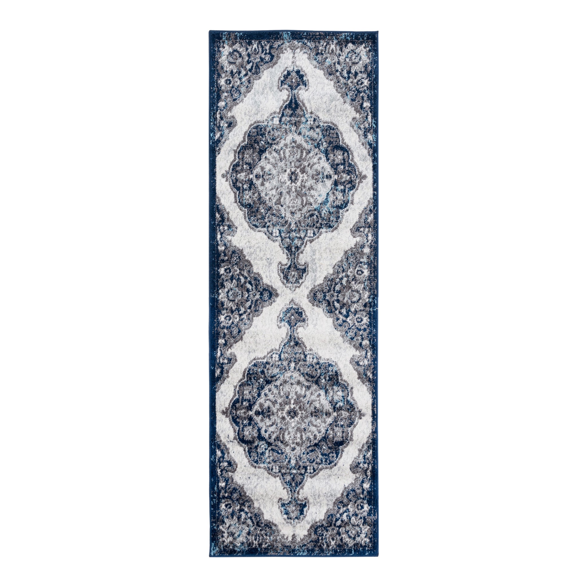 Add great coloration and comfortable texture to your space with this 2-foot x 3-foot navy and ivory medallion power loom area rug. This rectangle shaped rug features a medallion design in navy and ivory to give it visual interest. A classic shape marries with good looking design for your space ideal for spaces with kids and pets, this rug is stain resistant to help repel stains and spilled liquids. Place this area rug against a hardwood or tile floor and it will enliven your living space with style and sophistication. 24-inch H x 36-inch W x 0.38-inch D
