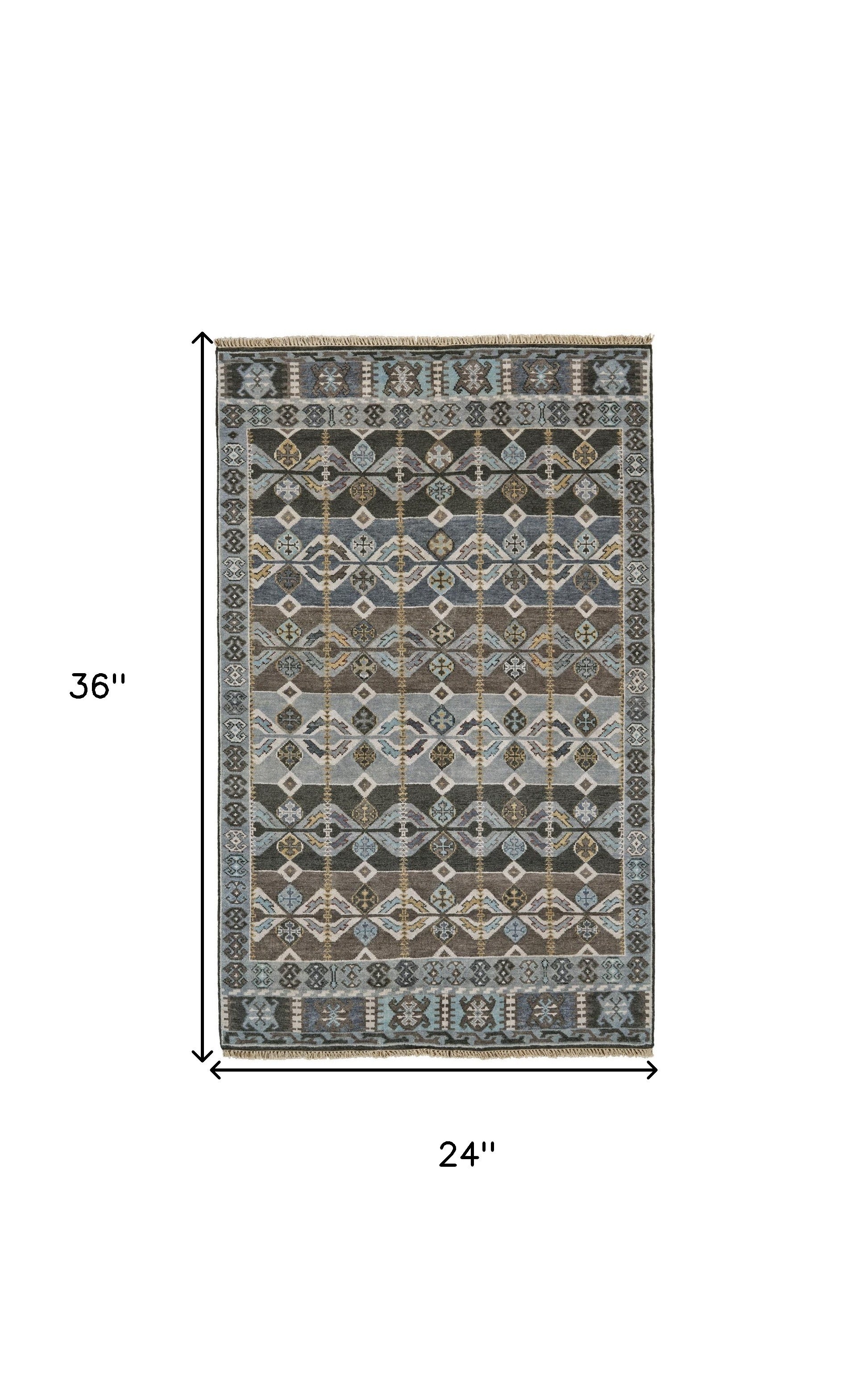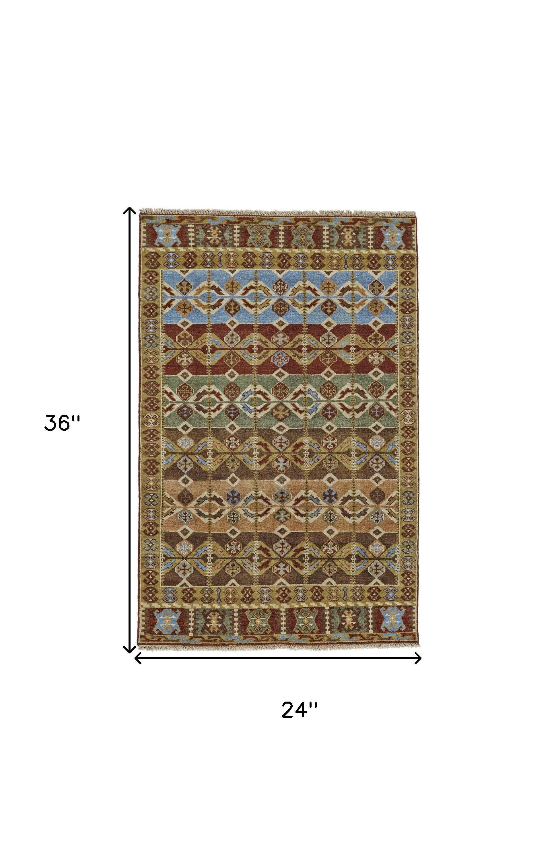 2' X 3' Red Blue and Brown Wool Southwestern Hand Knotted Area Rug