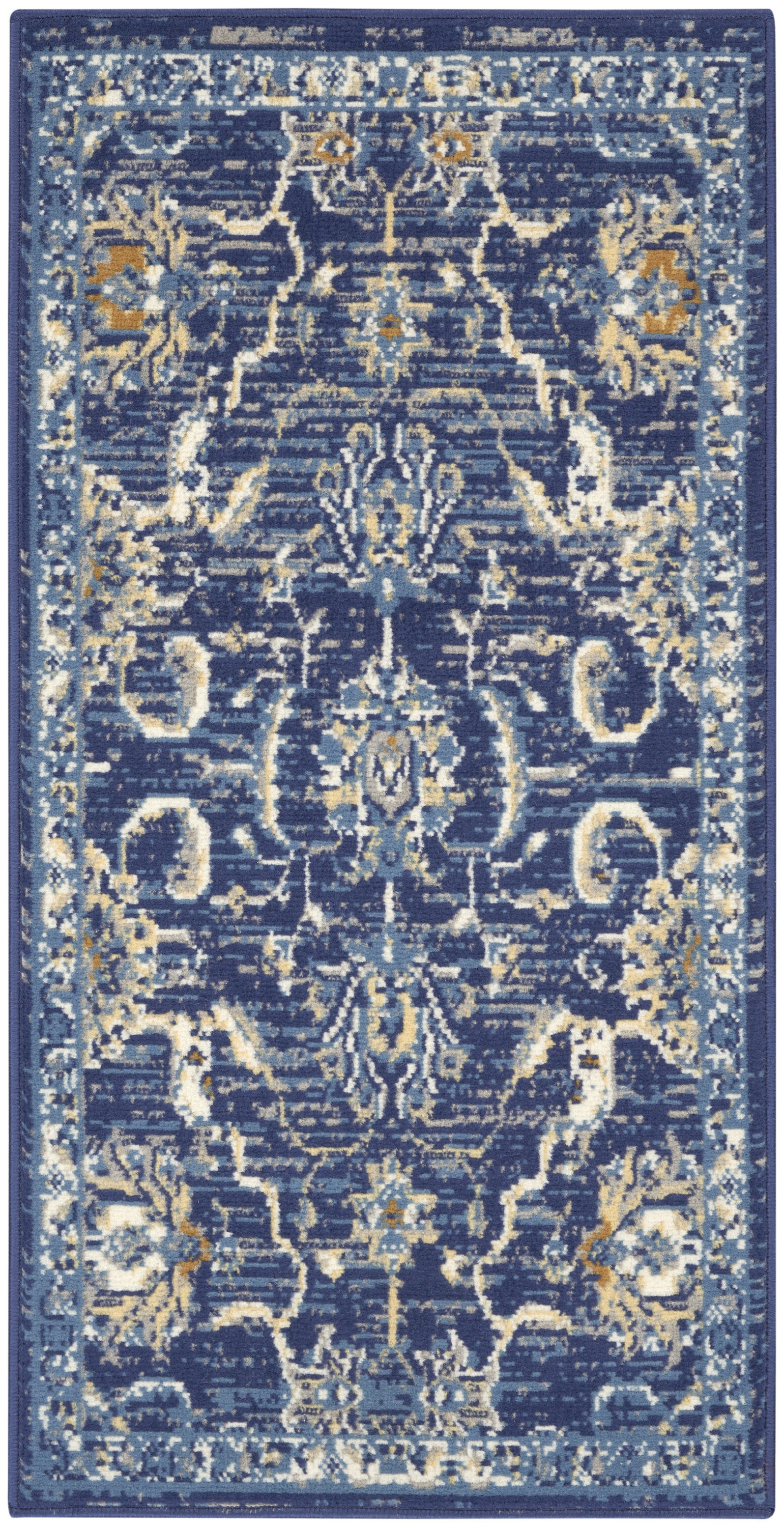 Set an inviting tone in your space with this 2-foot x 4-foot blue and gold oriental area rug. Built to last, this rug crafted from polypropylene fibers is known for its durability and long lasting appeal. Rugs are a great way to showcase your style, hide imperfections, warm your home and reduce noise. This smaller sized, traditional styled rug is just what you need for your walkway, bedside, in front of door, cabinet, refrigerator, or chair. 24-inch h x 48-inch w x 0.5-inch d.