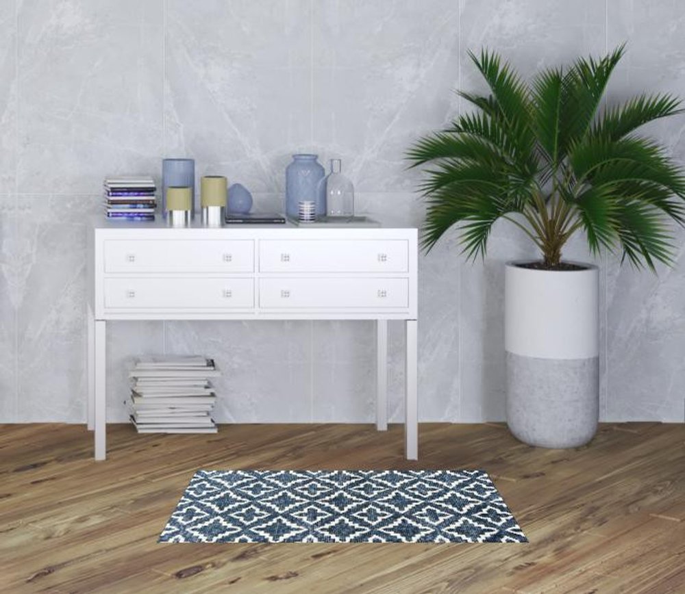 Add some artistry to your room with this 2' x 4' navy blue moroccan machine tufted area rug with uv protection. This rectangle shaped rug features a moroccan design in navy blue to give it visual interest. A classic shape marries with good looking design for your space Ideal for spaces with kids and pets, this rug is stain resistant to help repel stains and spilled liquids. Place this area rug against a hardwood or tile floor and it will enliven your living space with style and sophistication. 0.25" H x 27.5" W x 47" D