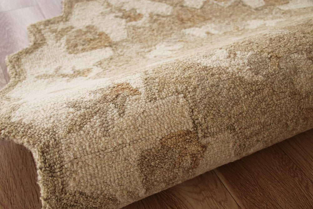 Bring a sense of refined luxury with this Round Tan Retro Modern Medallion Area Rug that accentuates a neutral palette to spruce up the area in front of a fireplace. Beautifully designed with intricate floral medallions in tan and a thick border around the edges flaunted on a beige backdrop to create visual interest. Crafted with 100% wool to ensure strength and durability to stand up to the elements of indoor areas with high foot traffic and resist stains to maintain the pristine look. The soft and moderate pile construction adds to the surface texture that feels luxurious on the touch. Upholding traditional patterns with soft hues, this area rug will be a classy accent to roll on the floor. 36"