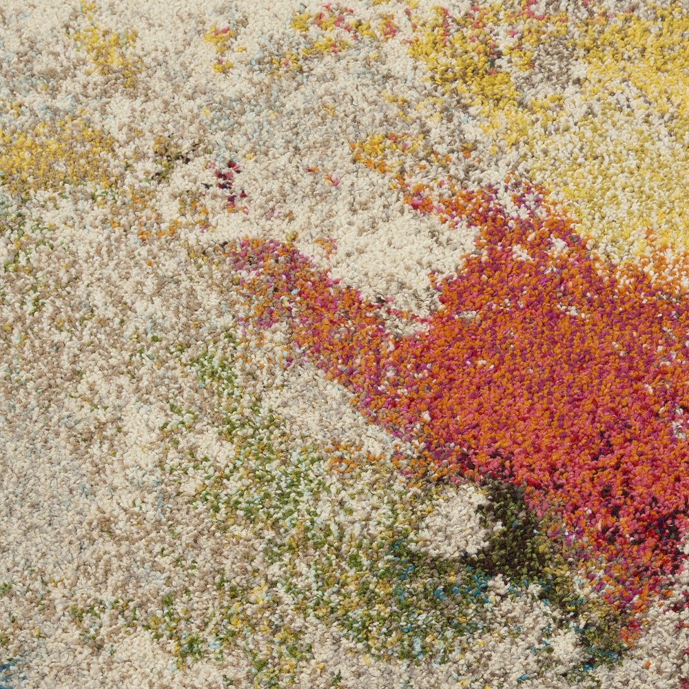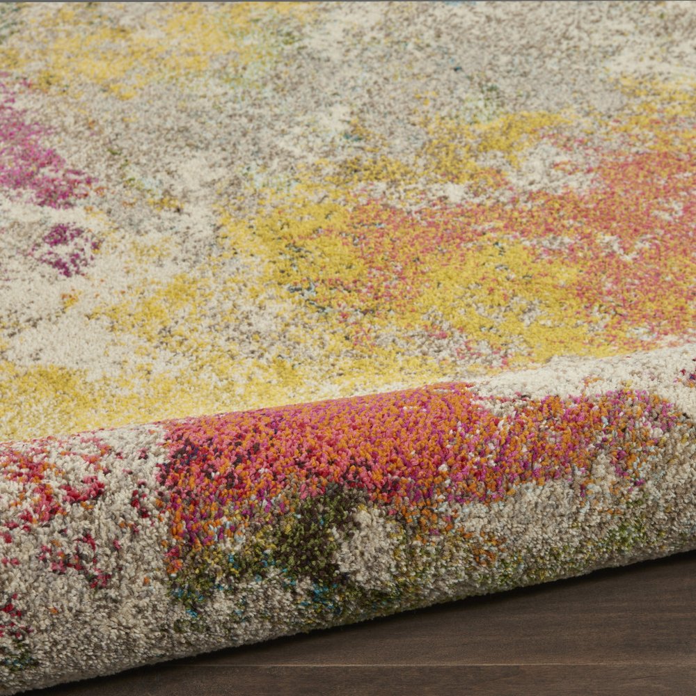 Set an inviting tone in your space with this 4-foot ivory abstract round rug. Built to last, this rug crafted from polypropylene fibers is known for its durability and long lasting appeal. Rugs are a great way to showcase your style, hide imperfections, warm your home and reduce noise. This geometric round shaped rug features a abstract pattern in ivory that combines a good looking print with a unique and updated shape. The mix of shape, color, and design gives this rug refreshing visual interest. 48-inch h x 48-inch w x 0.5-inch d.