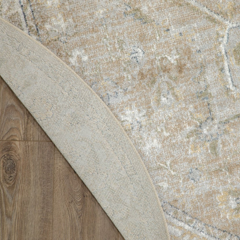 This 5-foot beige and ivory round floral medallion power loom washable area rug, is a great way to add warmth to a room. This geometric round shaped rug features a floral medallion pattern in beige and ivory that combines a good looking print with a unique and updated shape. The mix of shape, color, and design gives this rug refreshing visual interest. This larger sized rug is ideal to create a focal point or statement piece in your room. 63-inch h x 63-inch w x 0.25-inch d