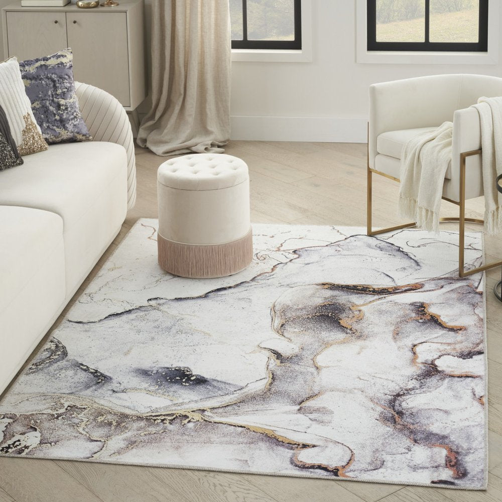 Set an inviting tone in your space with this 5-foot x 7-foot black and gold abstract power loom area rug. This rectangle shaped rug features a abstract design in black and gold to give it visual interest. A classic shape marries with good looking design for your space area rugs help to give warmth and sense of home to your space. 63-inch H x 87-inch W x 0.25-inch D