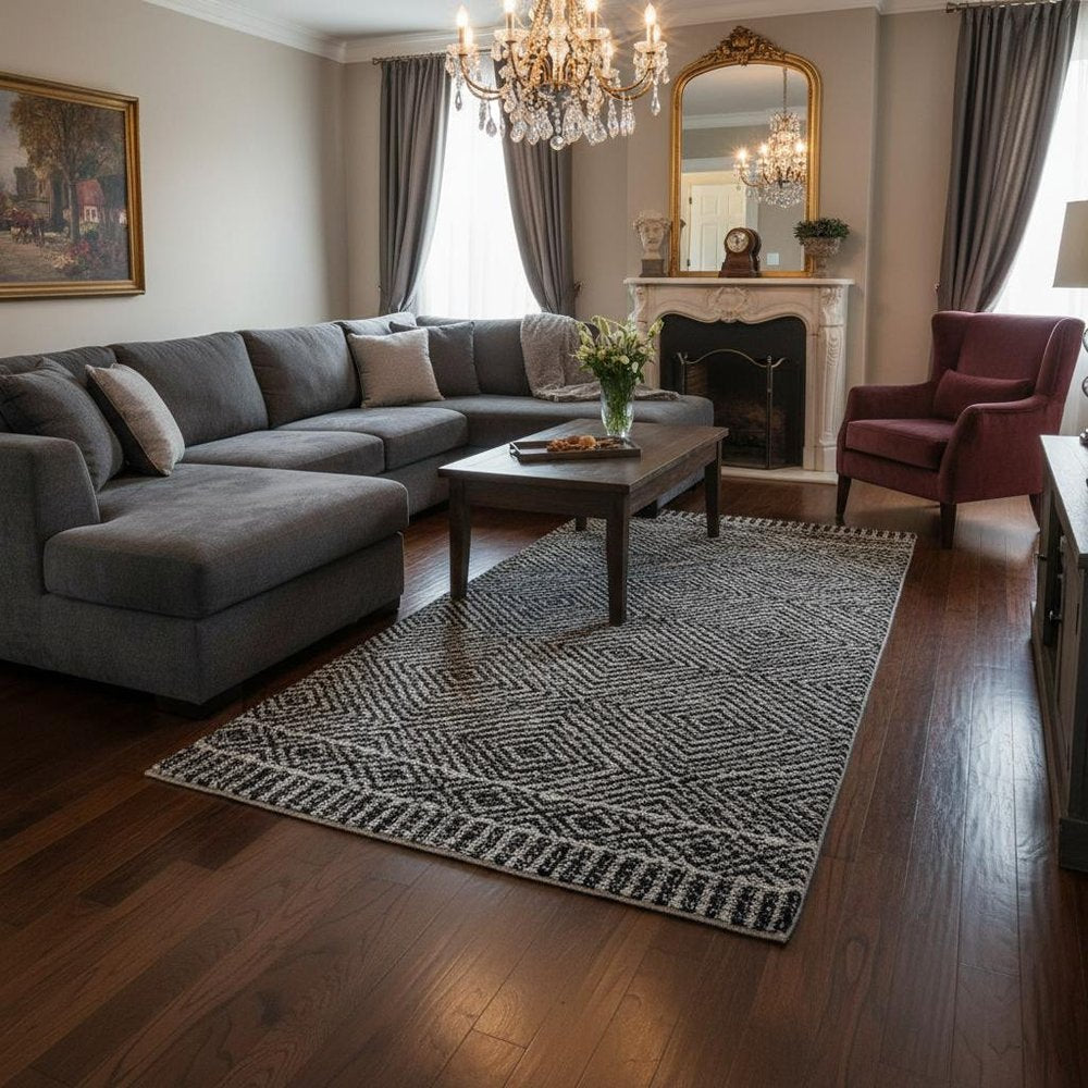 Set an inviting tone in your space with this 7-foot x 10-foot gray and black wool geometric hand tufted area rug. This rectangle shaped rug features a geometric design in gray and black to give it visual interest. A classic shape marries with good looking design for your space. 78-inch H x 114-inch W x 0.5-inch D
