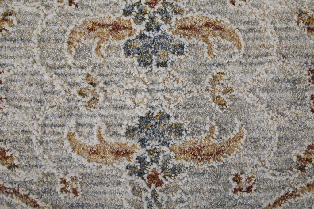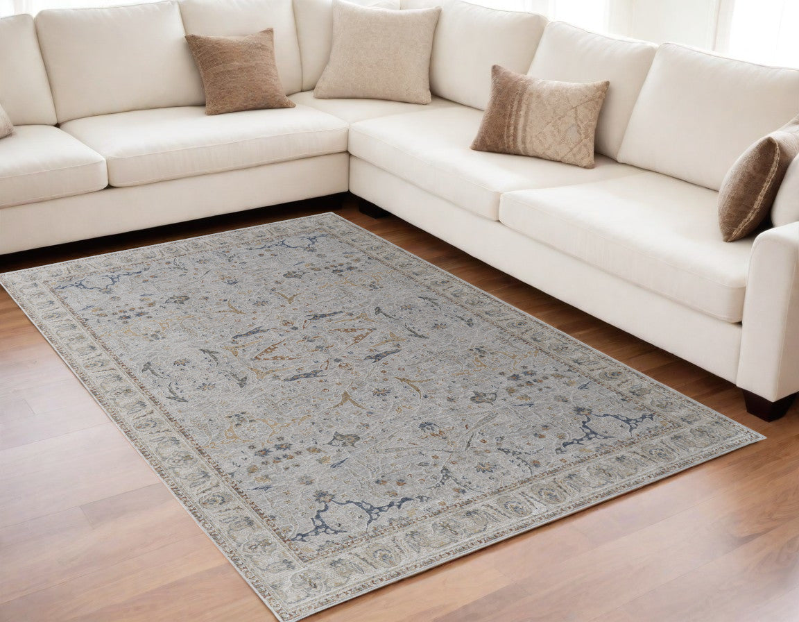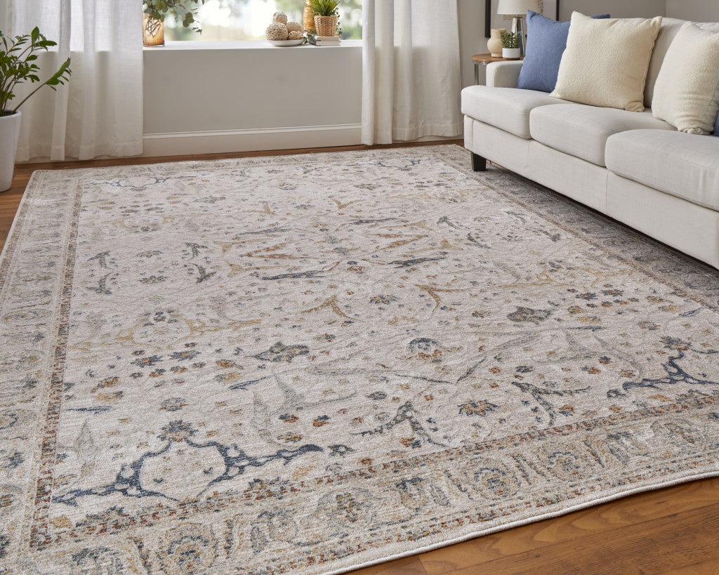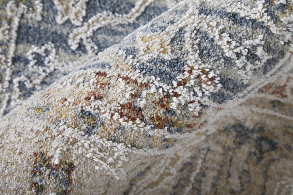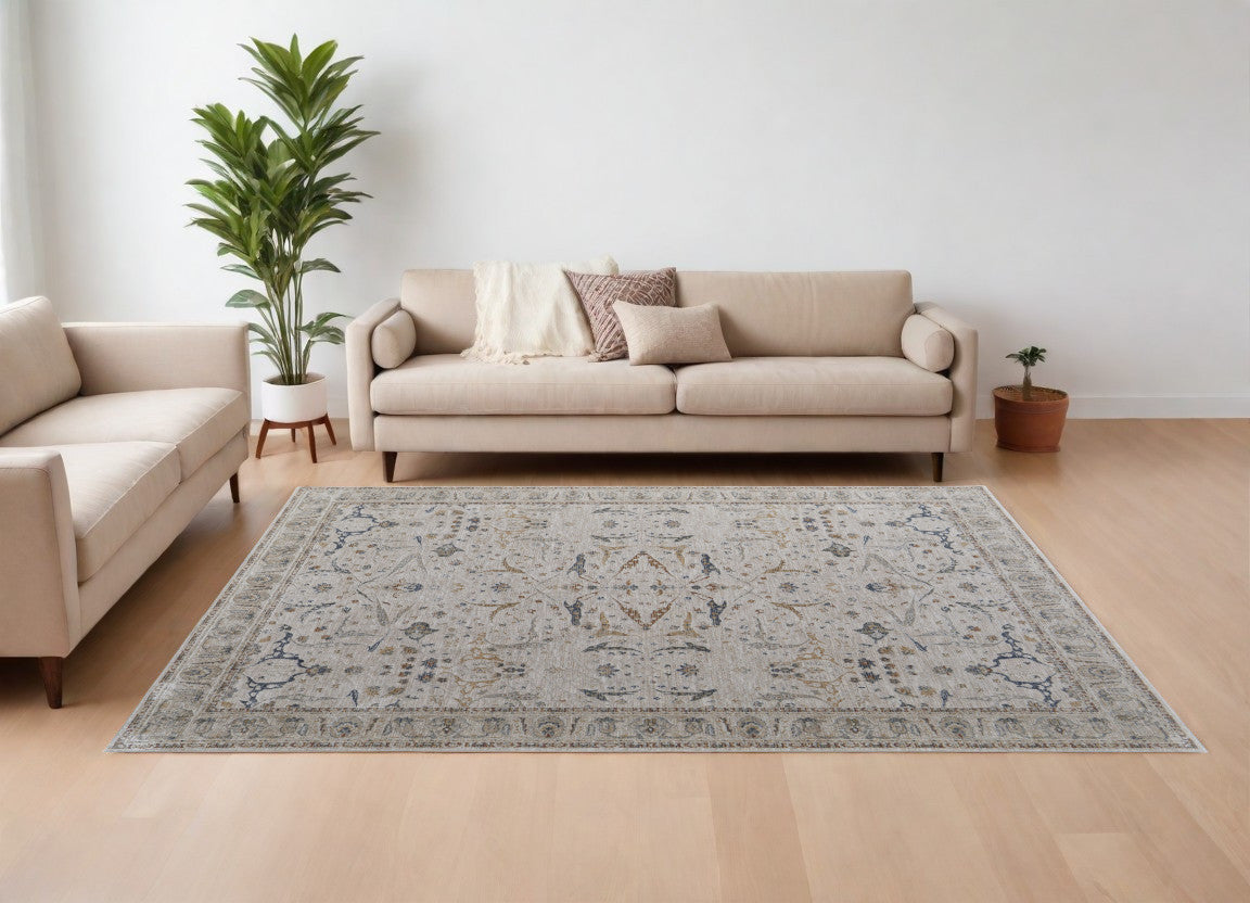 5' X 8' Taupe and Blue Ikat Power Loom Worn Faded Area Rug With Fringe