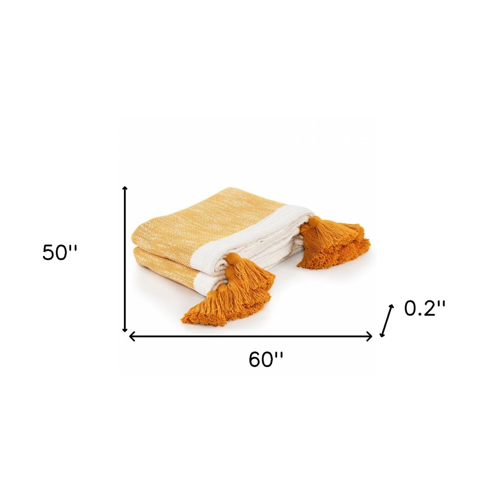 This 50-inch x 60-inch orange woven cotton striped throw blanket with tassels is a stylish addition to any sofa. Features a woven striped design that offers sumptuous softness and texture that you'll cherish for years to come. Made from cotton this blanket will make a great addition to any room it's added to. Add extra texture to your decor and turn your room into an inviting space. This cozy throw blanket makes the perfect add-on to movie nights and lazy afternoons. 60-inch H x 50-inch W x 0.2-inch D