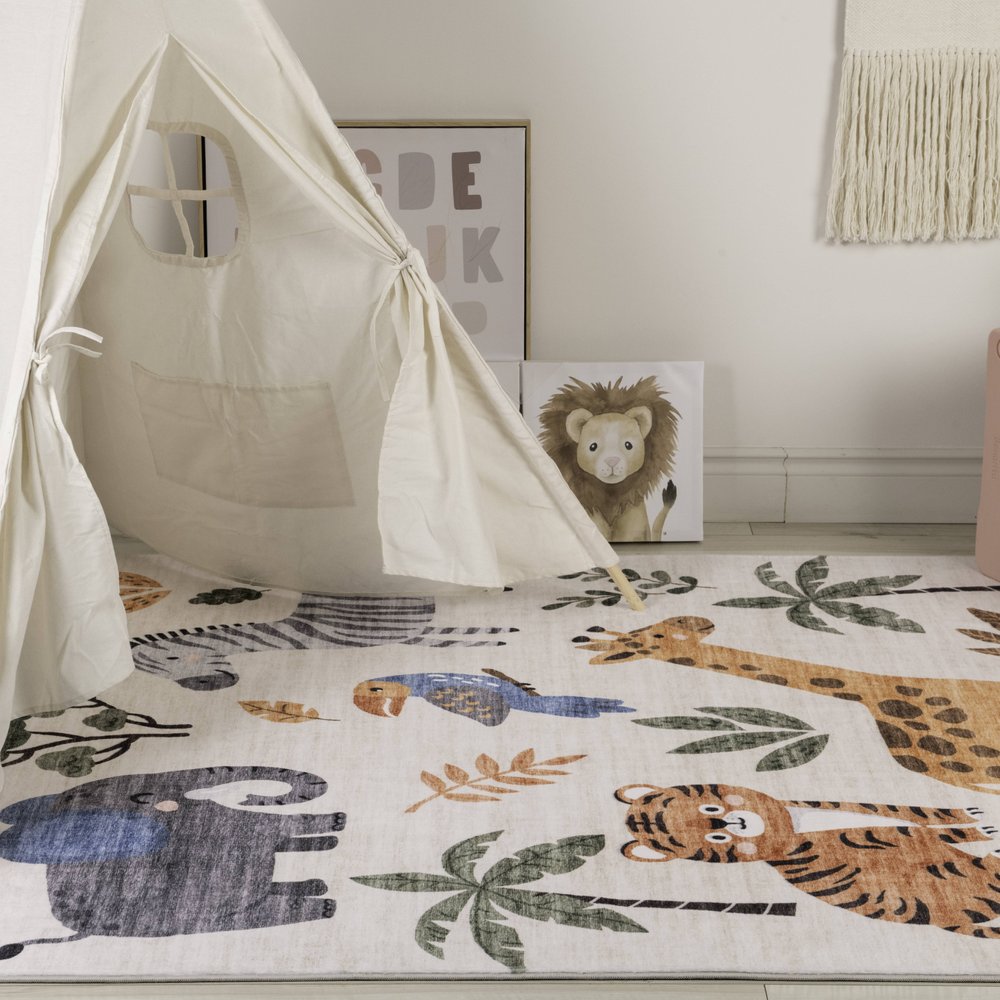 Add some artistry to your room with this 7-foot x 10-foot gray brown and green juvenile zoo animals youthful area rug. Features the perfect playful pattern that is ideal for child's bedroom, nursery, playroom, or den. This rectangle shaped rug features a youthful design in gray brown and green to give it visual interest. Ideal for spaces with kids and pets, this rug is stain resistant to help repel stains and spilled liquids. 79-inch H x 114-inch W x 0.4-inch D