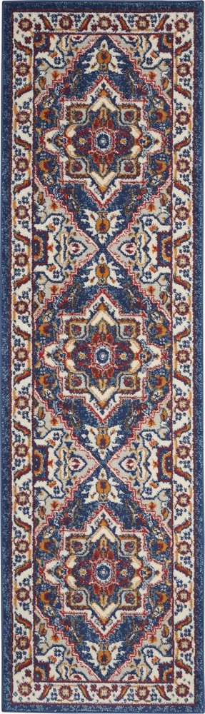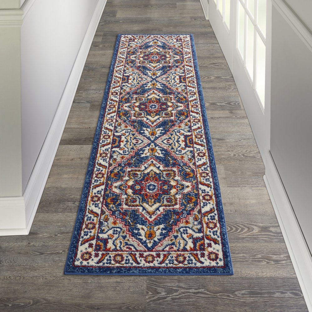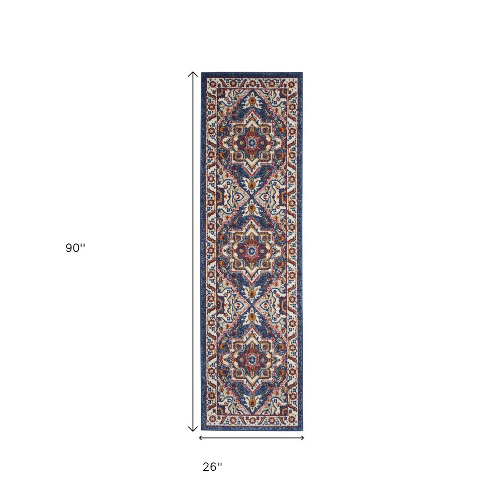 Add great coloration and comfortable texture to your space with this 8-foot blue and ivory medallion distressed runner rug. Built to last, this rug crafted from polypropylene fibers is known for its durability and long lasting appeal. Rugs are a great way to showcase your style, hide imperfections, warm your home and reduce noise. This rectangular shaped rug features a abstract design that will add a functional and decorative accent to your space. This traditional style runner makes a great accent for the hallway, in front of cabinets, in the laundry room, or any other space you need a narrow and long rug. 26-inch h x 90-inch w x 0.5-inch d.