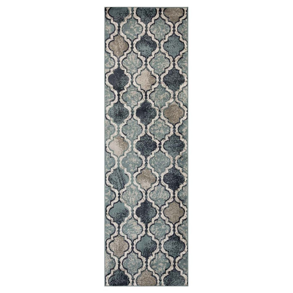 This 8-foot gray and ivory quatrefoil distressed runner rug, is a great way to add warmth to a room. Ideal for spaces with kids and pets, this rug is stain resistant to help repel dirt and spilled liquids. Built to last, this rug crafted from polypropylene fibers is known for its durability and long lasting appeal. Rugs are a great way to showcase your style, hide imperfections, warm your home and reduce noise. This transitional style runner makes a great accent for the hallway, in front of cabinets, in the laundry room, or any other space you need a narrow and long rug. 32.40-inch h x 96.00-inch w x 0.31-inch d.