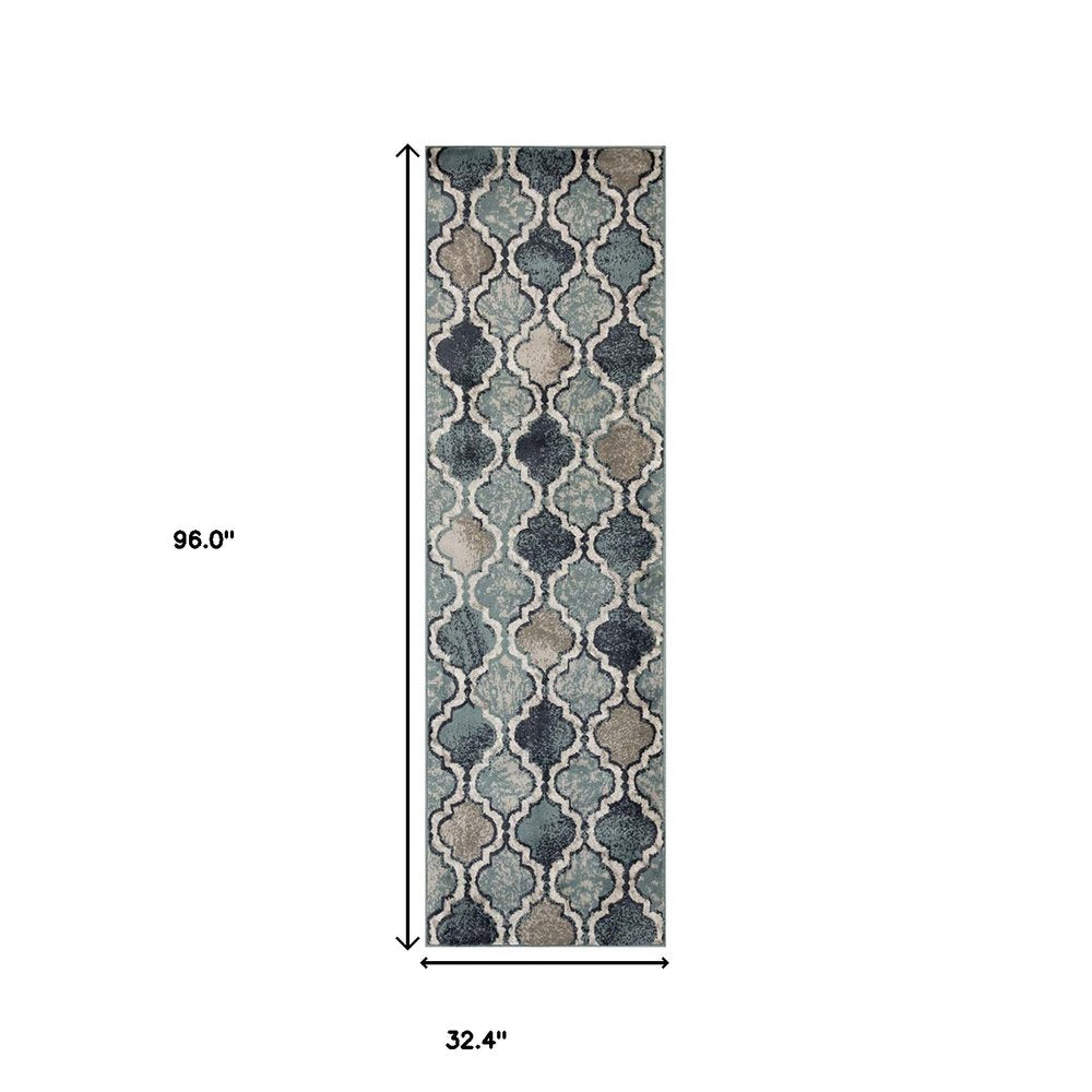 8' Gray And Ivory Quatrefoil Distressed Runner Rug