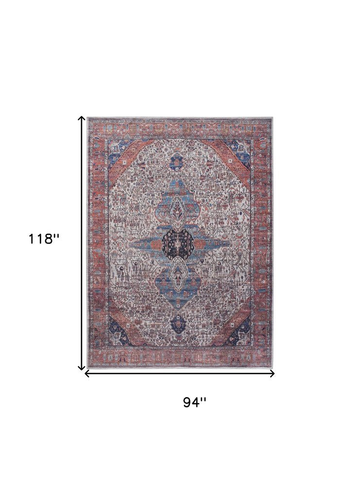 8' X 10' Red and Ivory Oriental Power Loom Distressed Washable Non Skid Area Rug