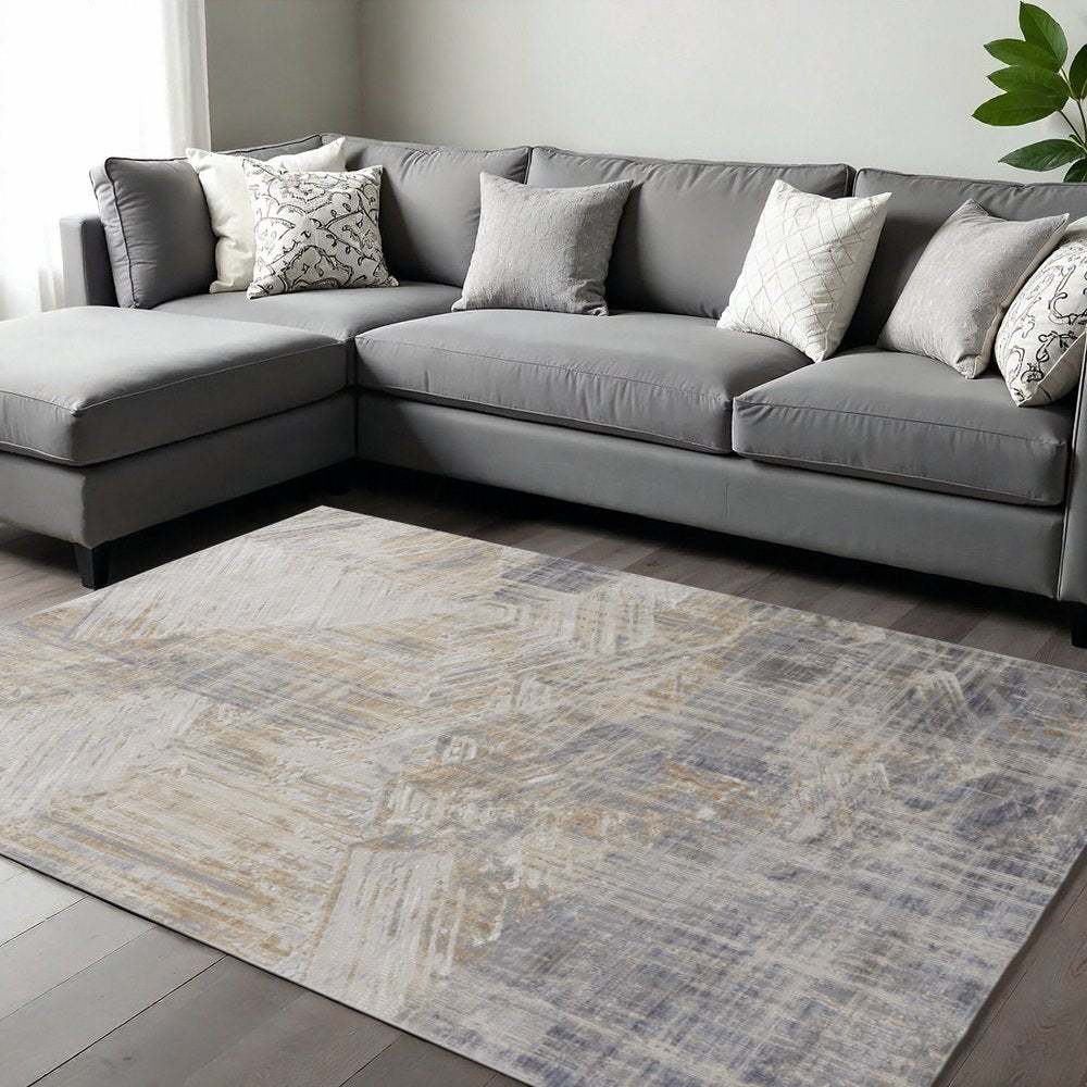 Add some artistry to your room with this 8-foot x 10-foot ivory gray and tan abstract distressed area rug. Built to last, this rug crafted from polyester fibers is known for its durability and long lasting appeal. Rugs are a great way to showcase your style, hide imperfections, warm your home and reduce noise. 94.00-inch h x 114.00-inch w x 0.28-inch d.