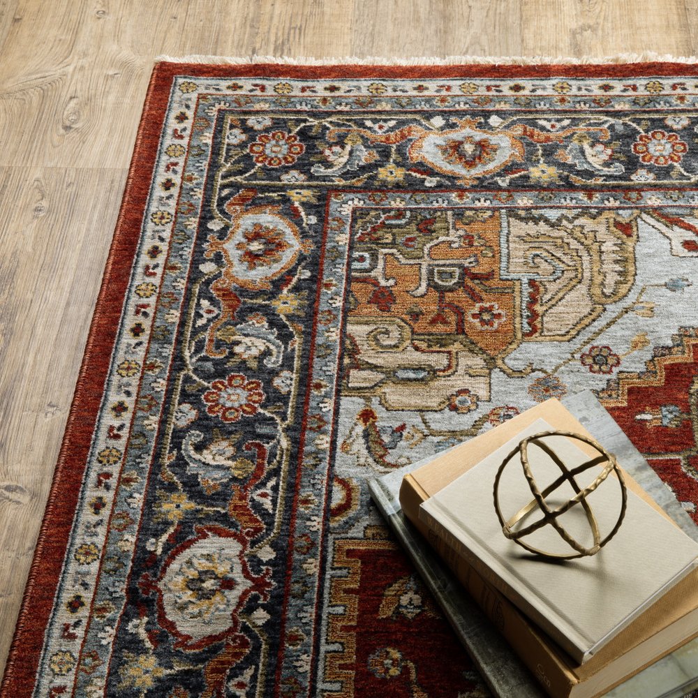 Set an inviting tone in your space with this 8-foot x 11-foot red and blue oriental area rug with fringe. Ideal for spaces with kids and pets, this rug is stain resistant to help repel dirt and spilled liquids. Built to last, this rug crafted from polyester fibers is known for its durability and long lasting appeal. Rugs are a great way to showcase your style, hide imperfections, warm your home and reduce noise. Tassel ends bring a timeless and fashionable look to your interior. 94.49-inch h x 133.86-inch w x 0.24-inch d.