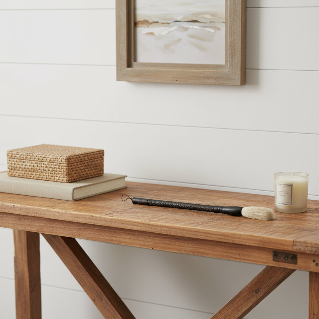 This dark brown carved scrollwork decorative calligraphy brush will add a beautiful and unique accent to your decor. Inspired by the origins of Chinese calligraphy, this brush is now used as a decorative accent known as a sign of peace. Made of wood that is intricately carved, combined with fine horsetail for the brush, this unique accent is sure to be a statement piece. Can hang on the wall or use as tabletop accent. Instantly liven up your space with this art that brings color and dimension to your space. 1" H x 15.35" W x 1" D